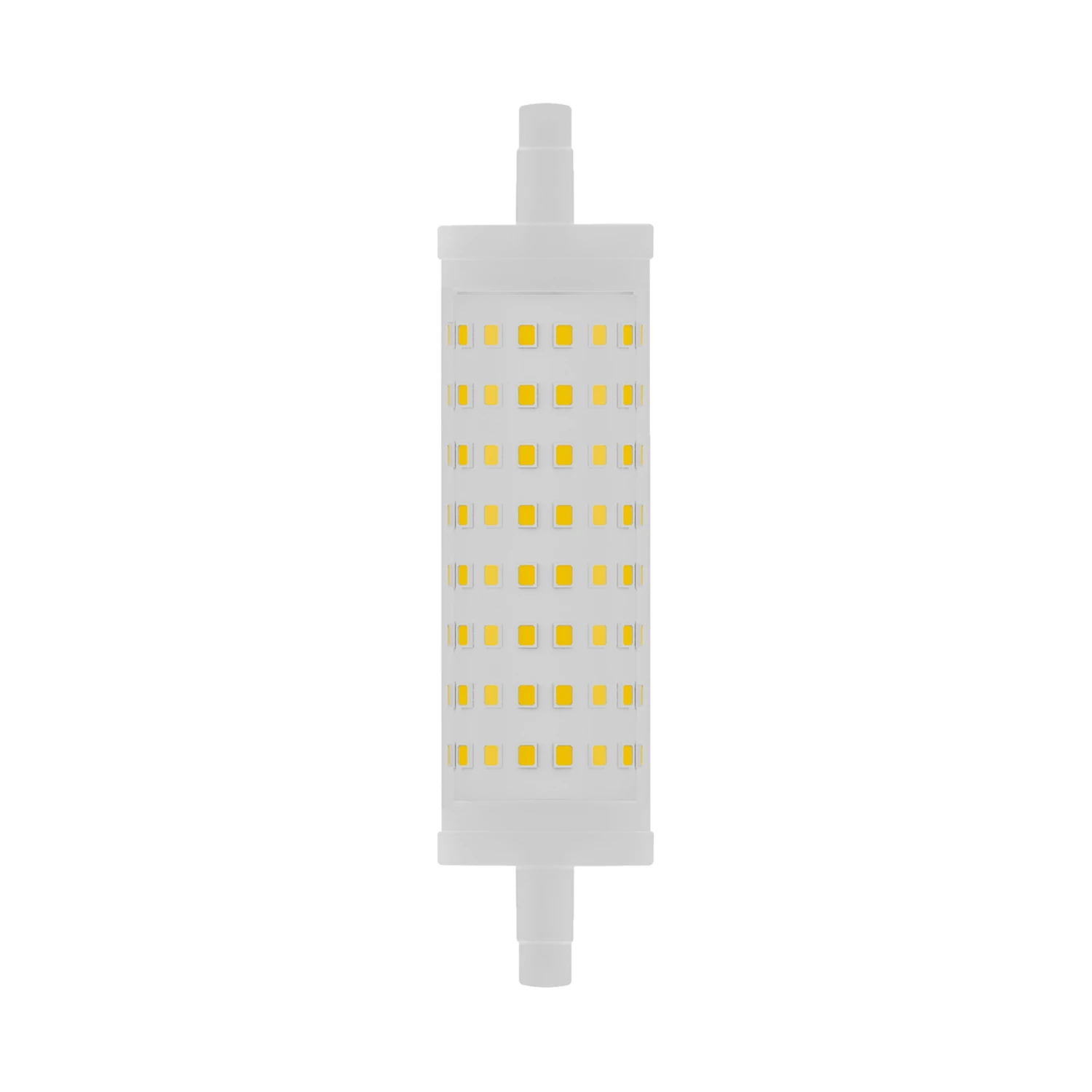 Diese dimmbare LED-Stablampe mit R7s Sockel stellt einen energieeffizienten und sparsamen Ersatz für herkömmliche Halogenlampen dar und erzeugt leuchtstarke 2.000 Lumen, die sich für große Räumlichkeiten und Bereiche eignen. Das abstrahlende warmweiße Licht wird über den klaren Kolben rundherum abgegeben.