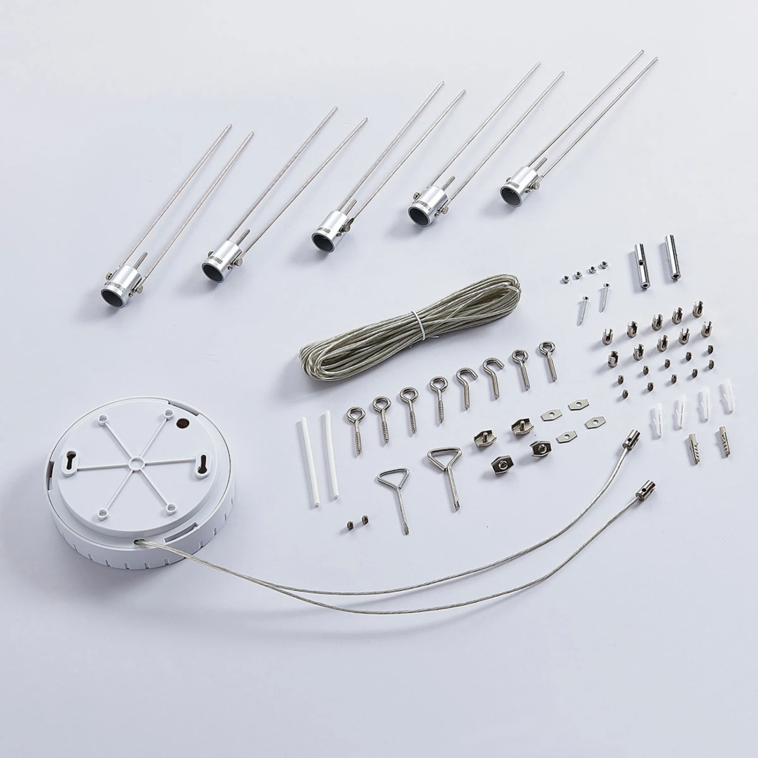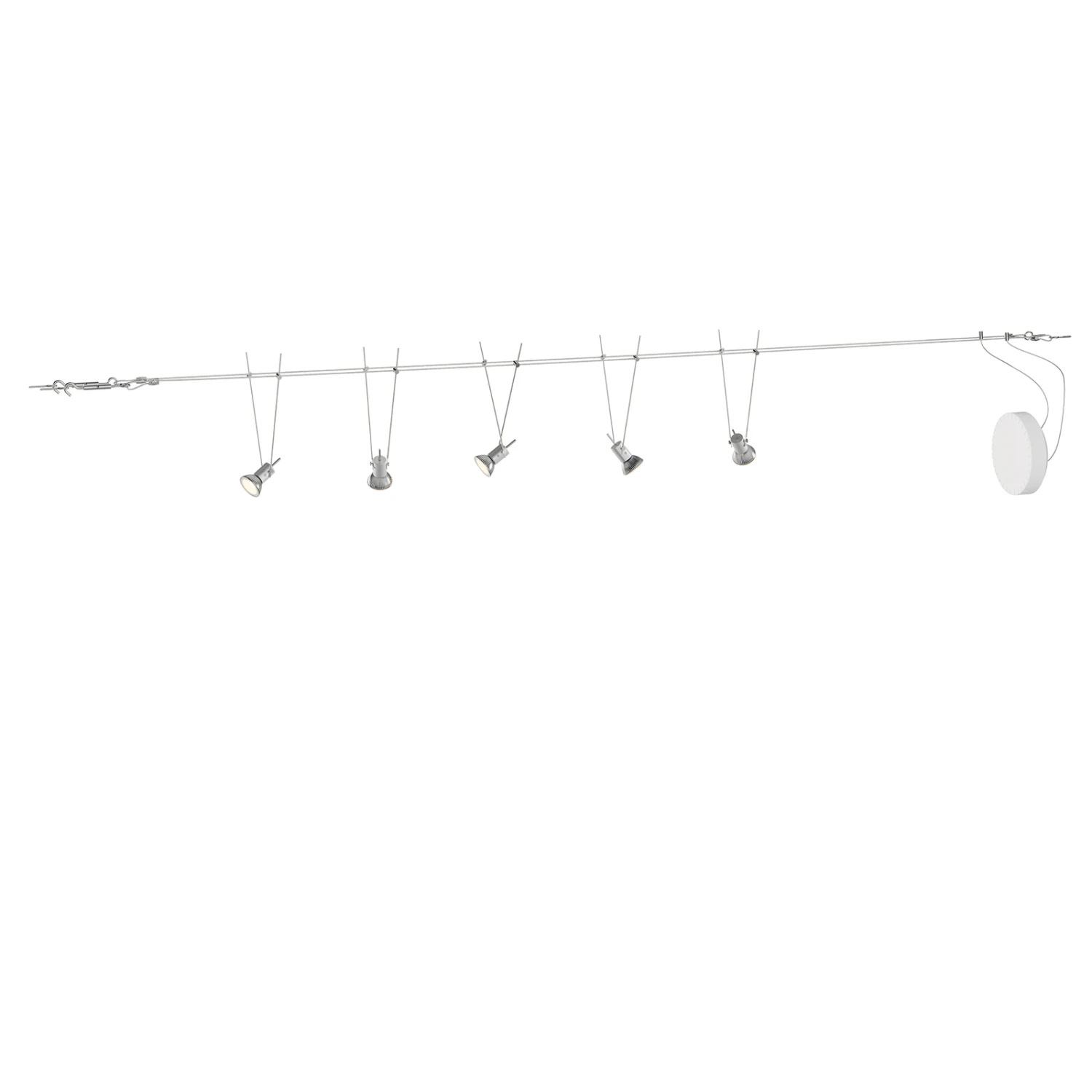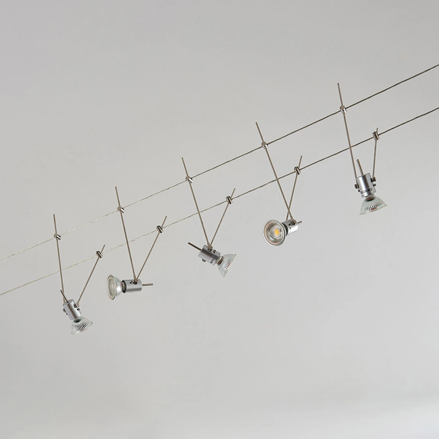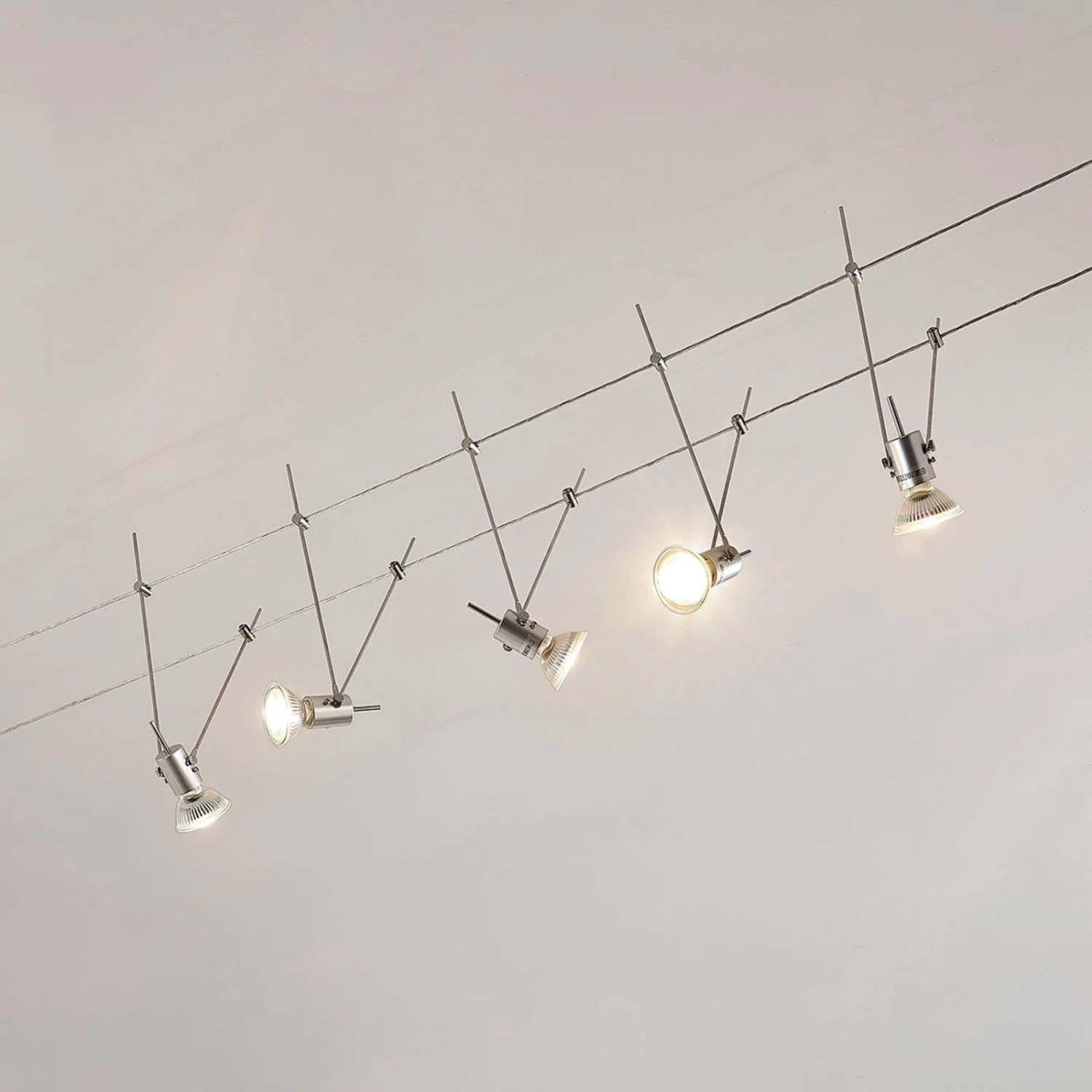 Die beiden Seile dieser modernen Designer-Beleuchtung verlaufen parallel zueinander an der Decke, während in frei wählbarem Abstand fünf GU5.3-Halterungen von ihnen hinab hängen. Mit einem solchen Seilsystem wird eine moderne Raumgestaltung möglich, die Beleuchtung und ein futuristisches Design in sich zu vereinen weiß.