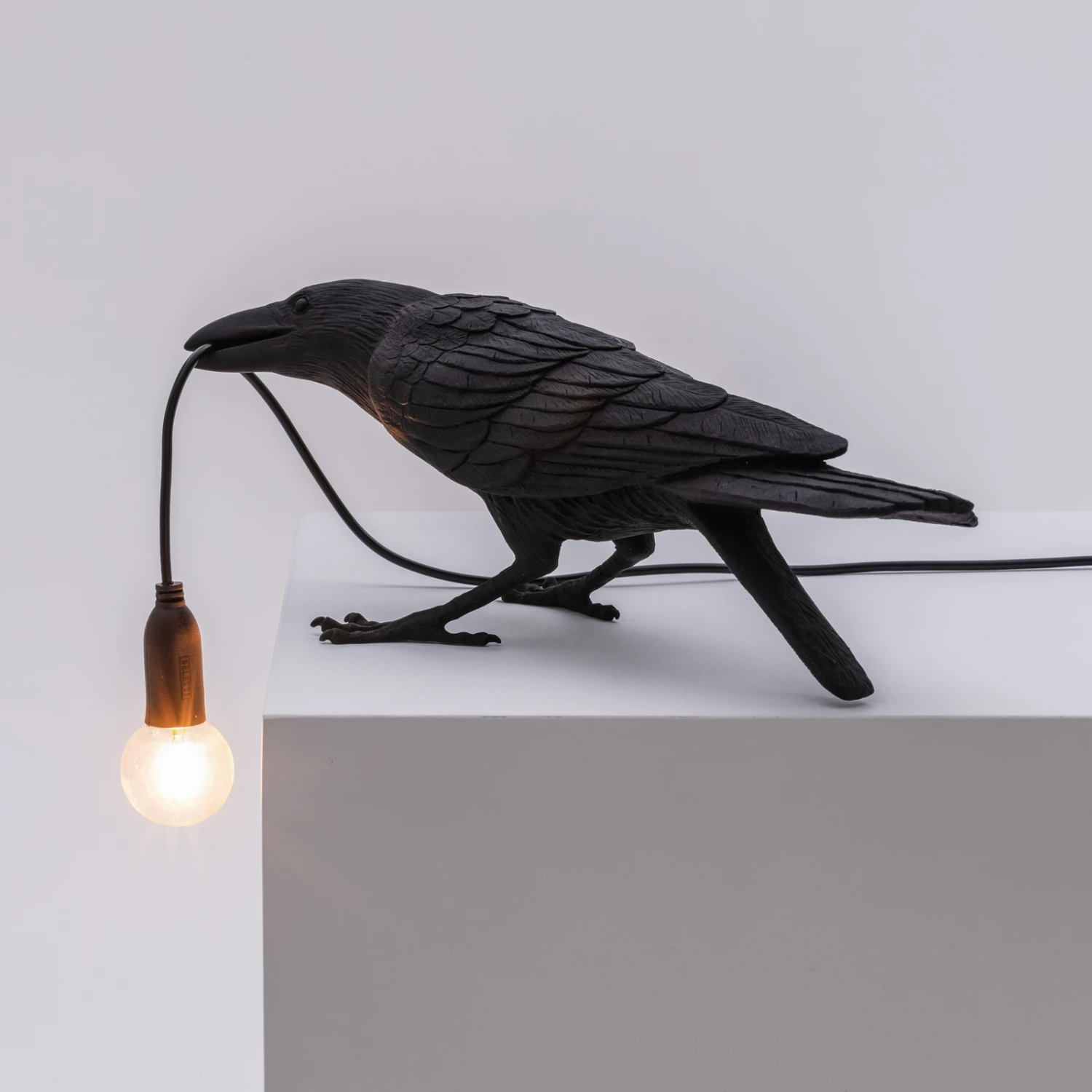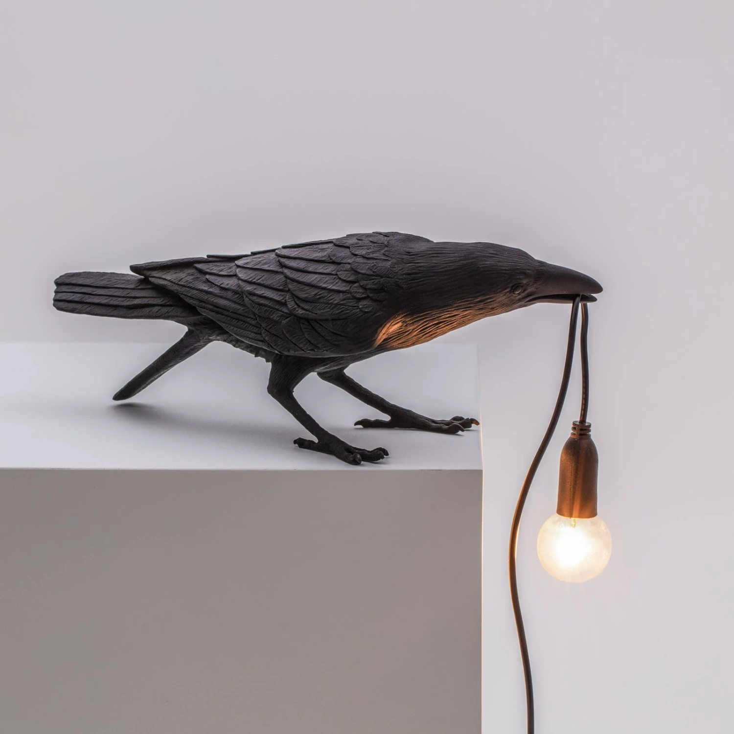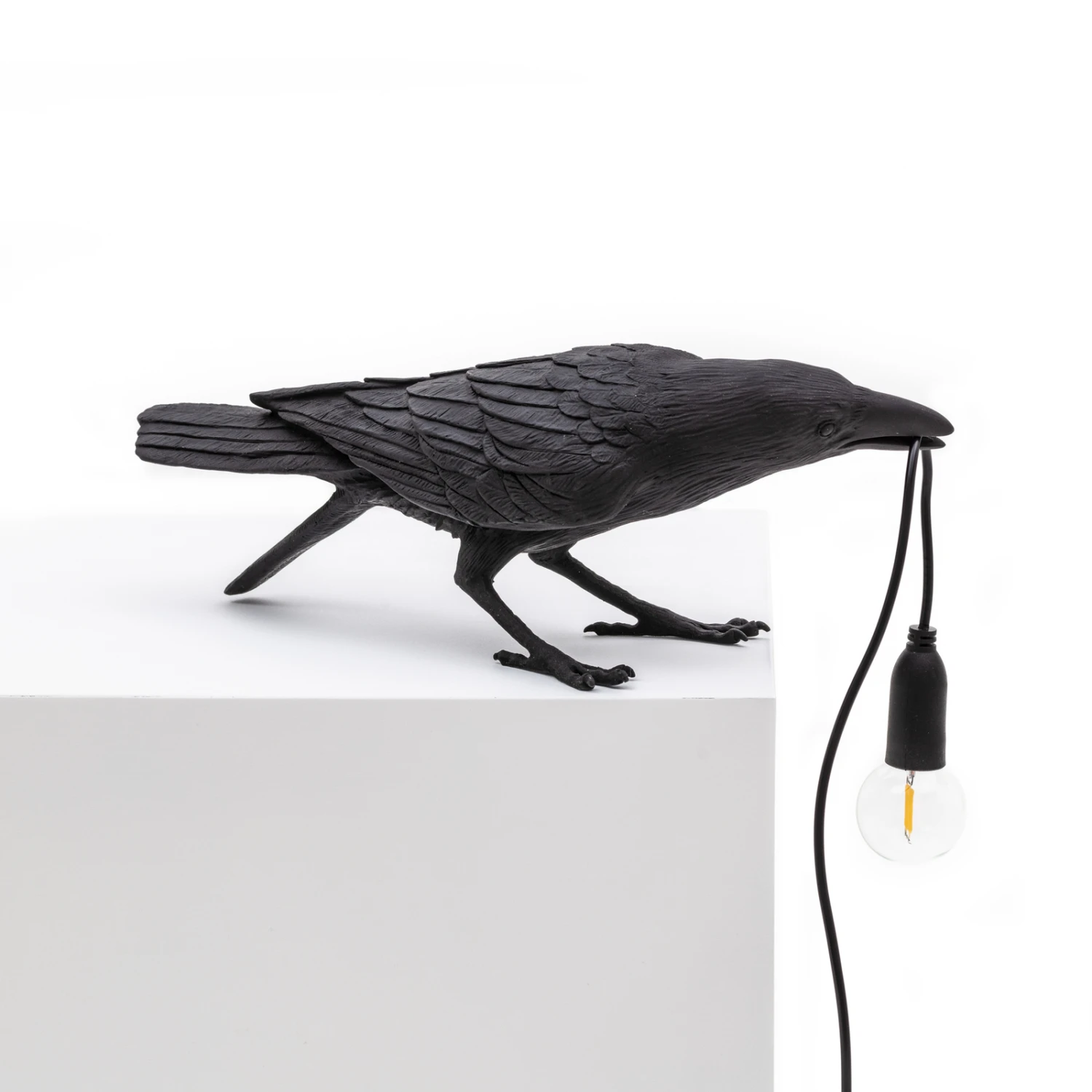 Im Eingangsbereich, auf der Terrasse oder im Garten platziert dient Bird Lamp als leuchtendes Dekoobjekt. Die aus Kunstharz gearbeitete Vogelfigur nimmt eine spielende Stellung ein und hält mit ihrem Schnabel ein Kabel, das in eine E14-Fassung mit Niedervolt LED-Filamentlampe mündet.