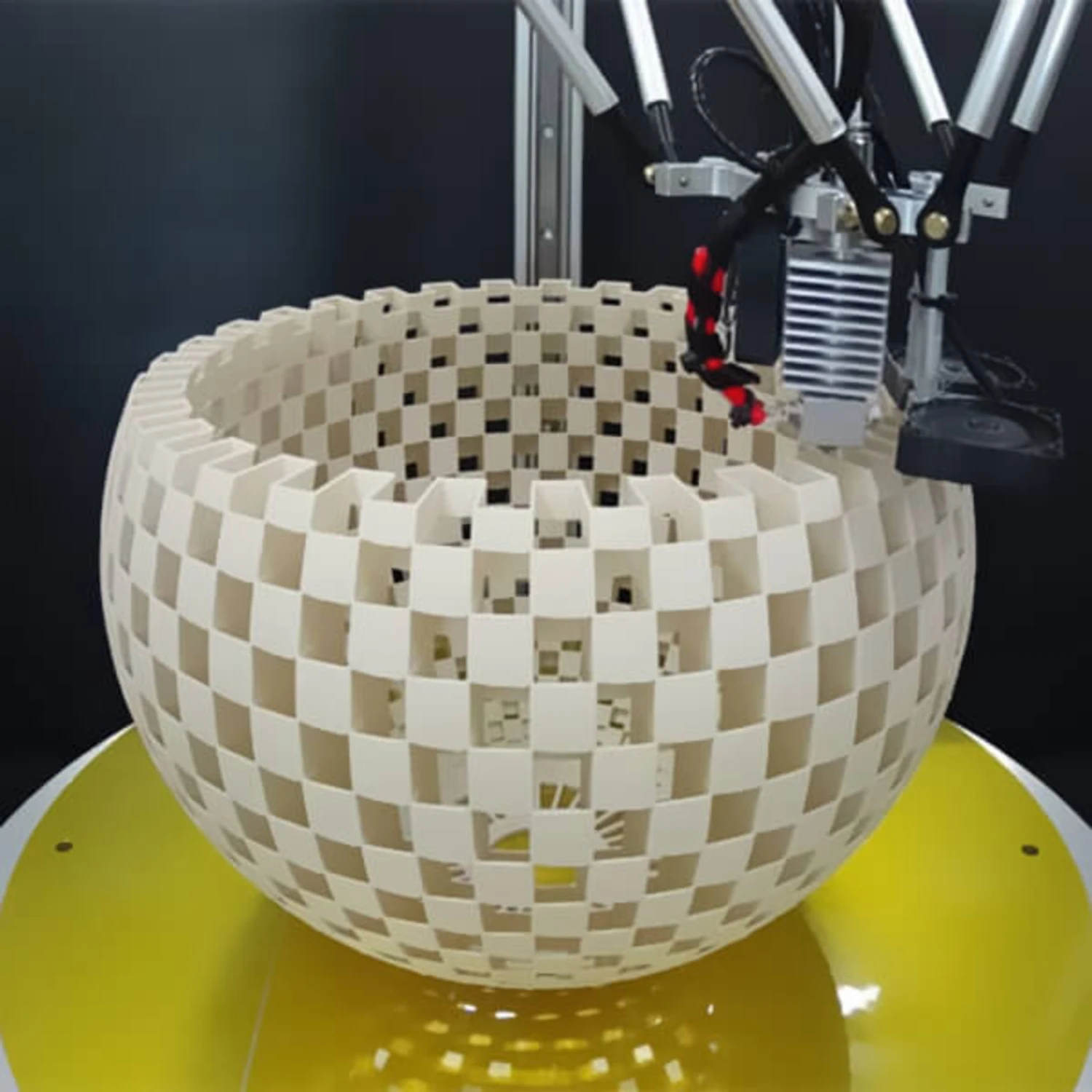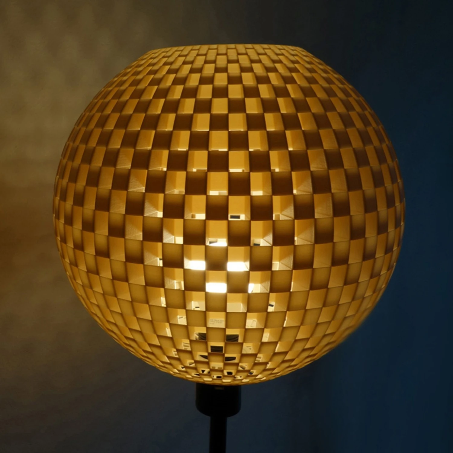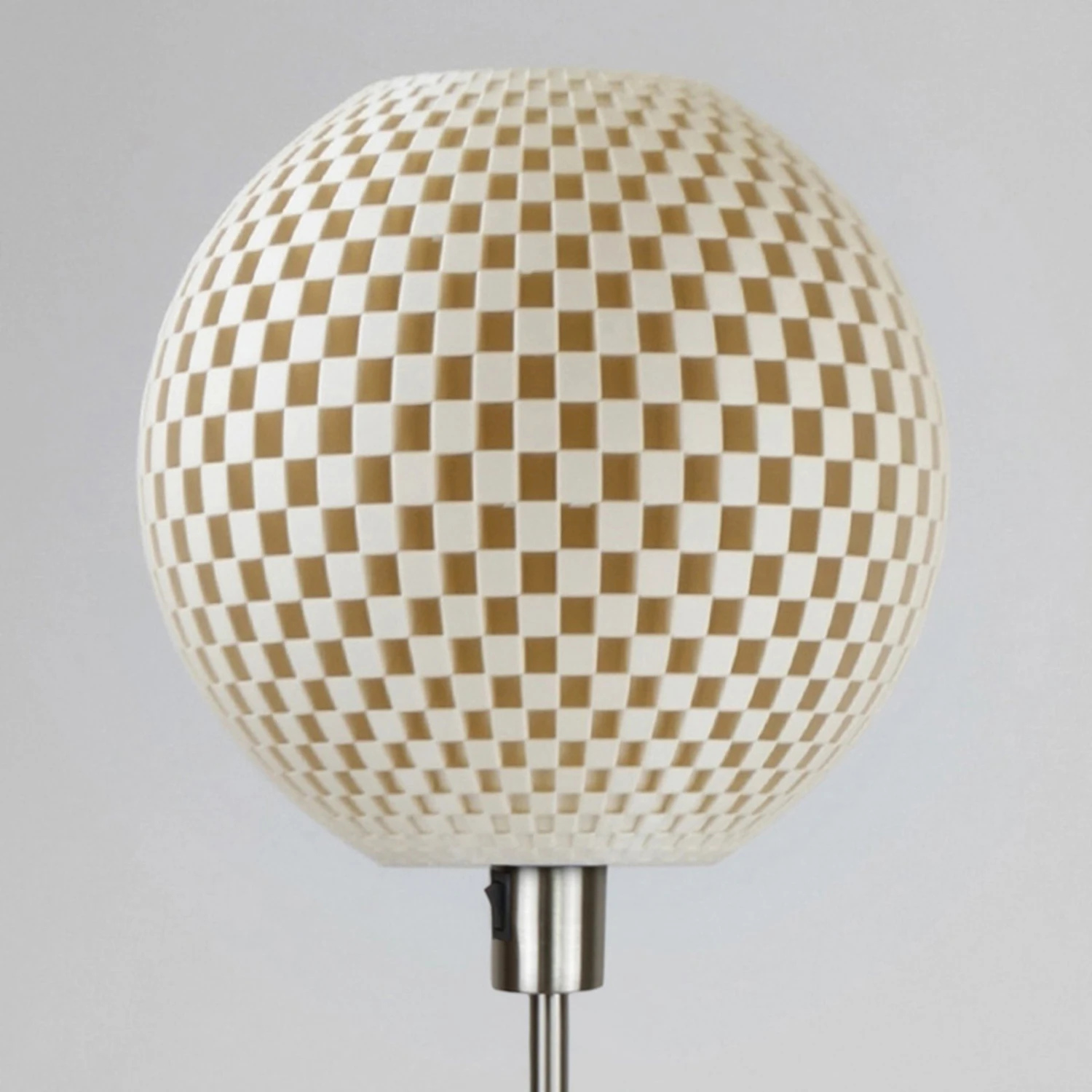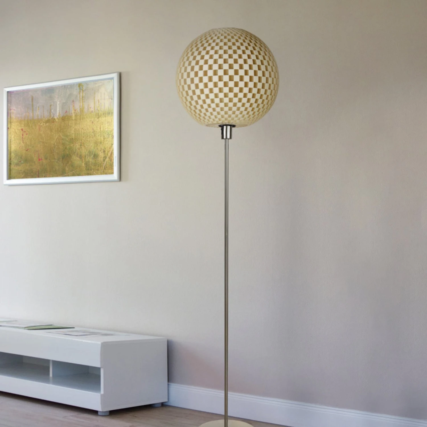 Design-Stehleuchte Flechtwerk mit kugelförmigem Schirm, der im 3D-Druckverfahren gefertigt worden ist