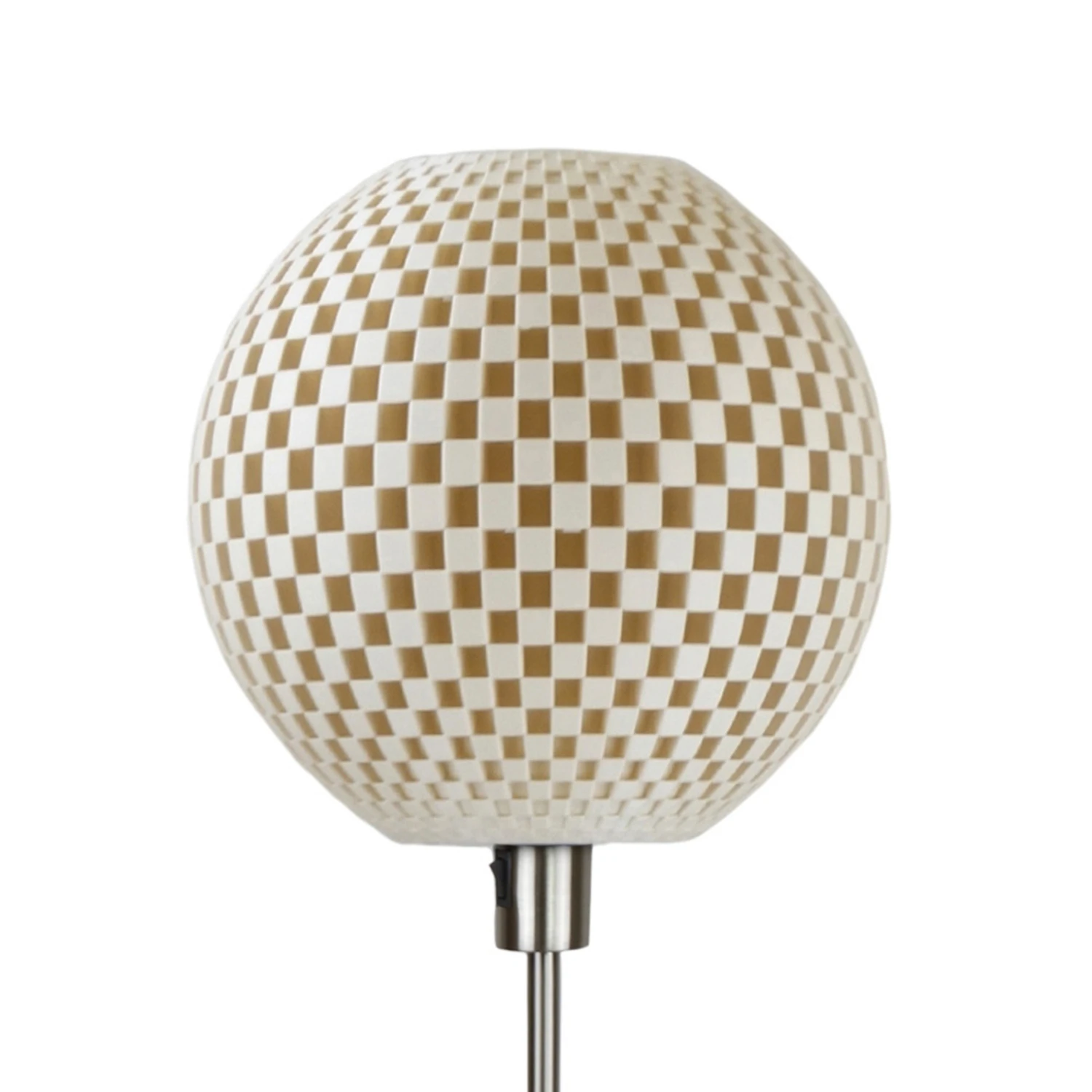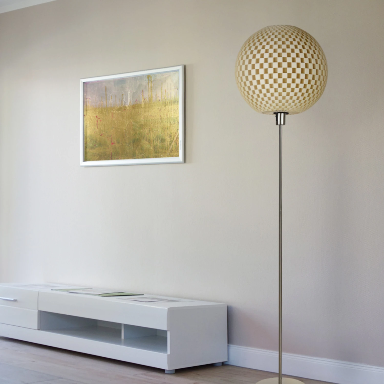 Optisch erinnert dieser kugelrunde Leuchtenschirm so manch einen vielleicht an Kindertage, als man noch hin und wieder an einem Flechtwerk aus Papierstreifen gebastelt hat, das zum Schluss eine dekorative Webstruktur besessen hat. Wie eine solche Oberfläche erscheint nämlich auch der Schirm der Stehleuchte mit dem hellen Farbton, nur dass es sich eigentlich um zahlreiche schachbrettartige Auslassungen handelt, die man auf dem Schirm sieht. Das ist bei eingeschalteter Leuchte ein wahres Vergnügen, weil das die Lichtwirkung besonders effektvoll macht. Auch im Raum sieht man selbstverständlich entsprechende Effekte aus Licht und Schatten mit ihrer einzigartigen Wirkkraft.