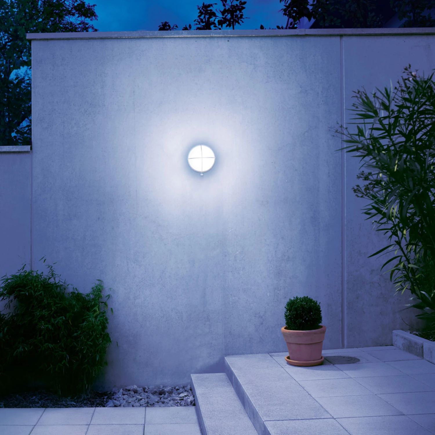 Während vier vorinstallierte Programme auf dem Sensormodul bereits eine sinnvolle Auswahl ermöglichen, sind die Funktionen der Wandleuchte auch frei konfigurierbar. Neben der von 5 s bis 15 min einstellbaren Leuchtdauer ist auch ein Dauerlichtbetrieb von 4 h schaltbar. Zudem steht eine Grundlichtfunktion für die Dauer der Nacht, 10 min oder 30 min zur Verfügung. Die Ansprechschwelle ist zwischen 2 und 1.000 Lux Umgebungshelligkeit frei einstellbar. Um eine Blendwirkung bei Dunkelheit zu vermeiden, besteht die Option zum allmählichen Hochfahren der Lichtleistung (Softlichtstart). Der passive 360 °-Infrarotsensor registriert Bewegungen in einer Entfernung von bis zu 7 m.