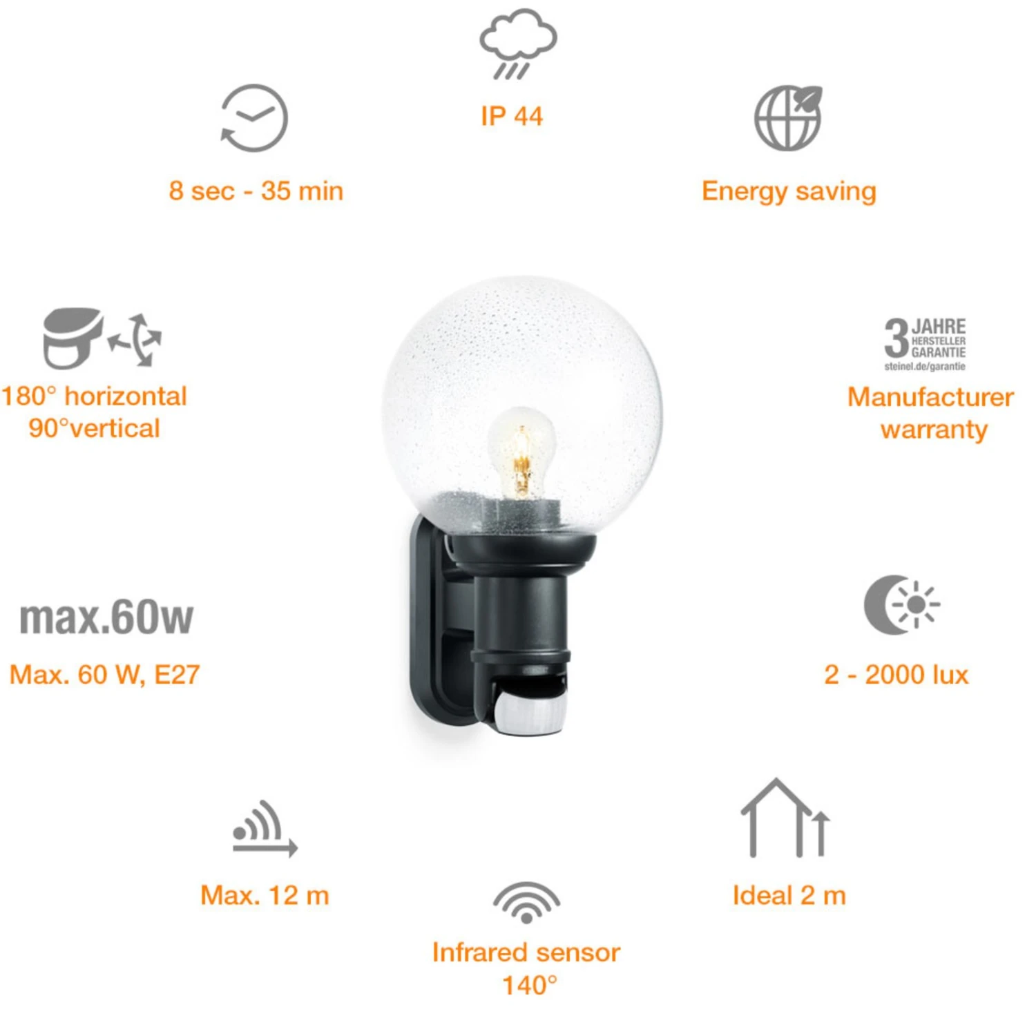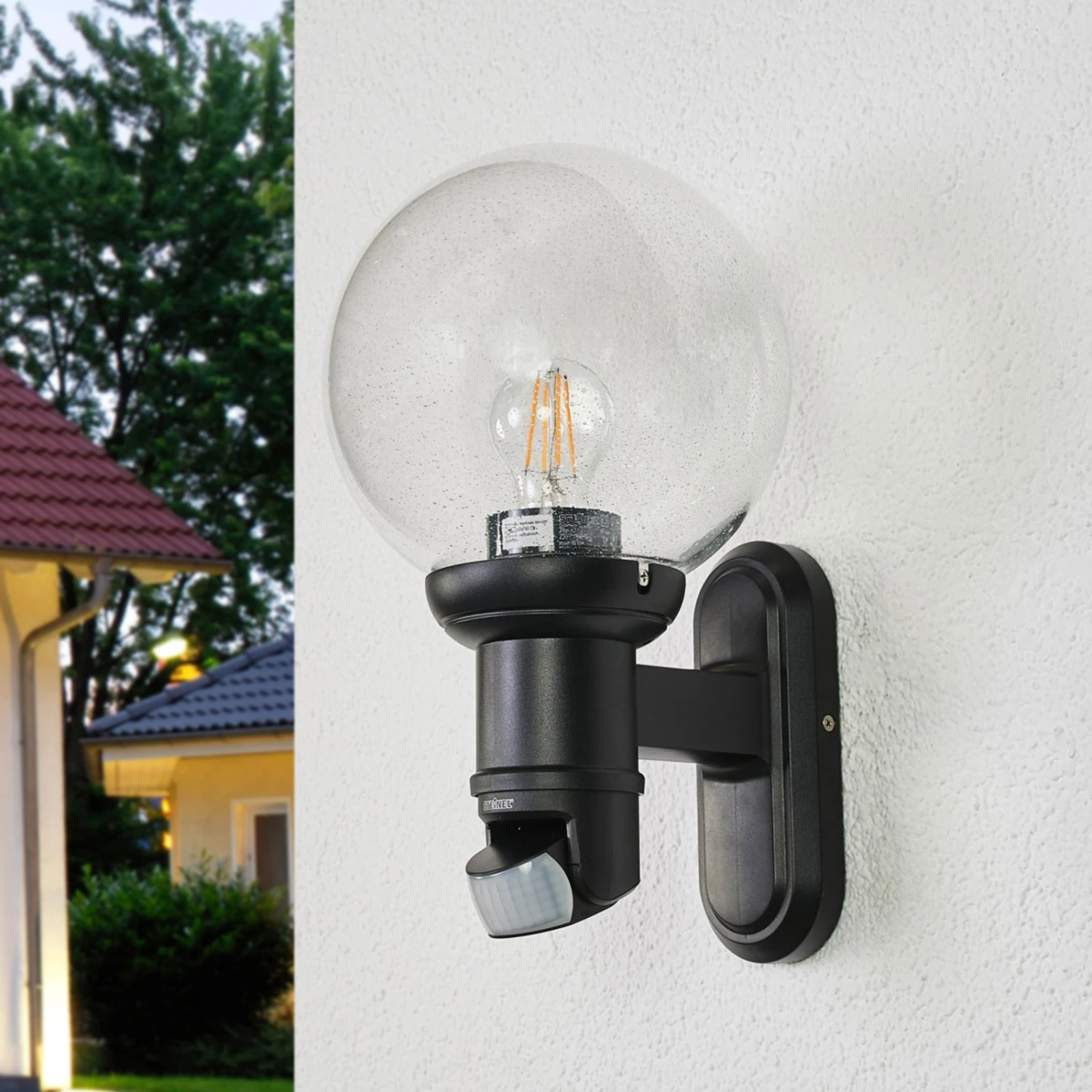 Außenwandleuchte L 560 S mit Bewegungsmelder, Dämmerungssensor und klassischem Glas-Kugelschirm