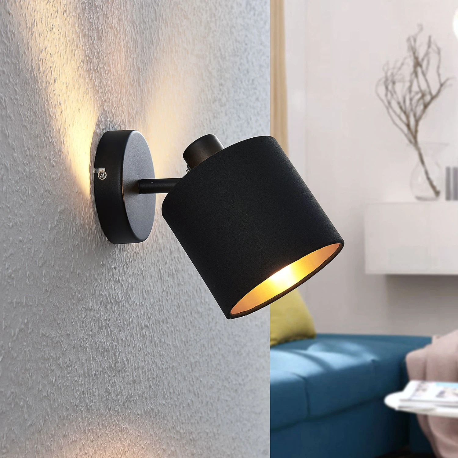 Dank des schwarzen Äußeren präsentiert sich die Lampe als dezenter Hingucker, der angeschaltet zum echten Highlight wird. Das goldene Innere schenkt dem Licht einen edlen Schimmer, der durch den Stoffbezug auch rückwärts an die Wand strahlt. So können besondere Bilder oder andere Einrichtungsgegenstände, an denen das Herz hängt, stimmungsvoll in Szene gesetzt werden.