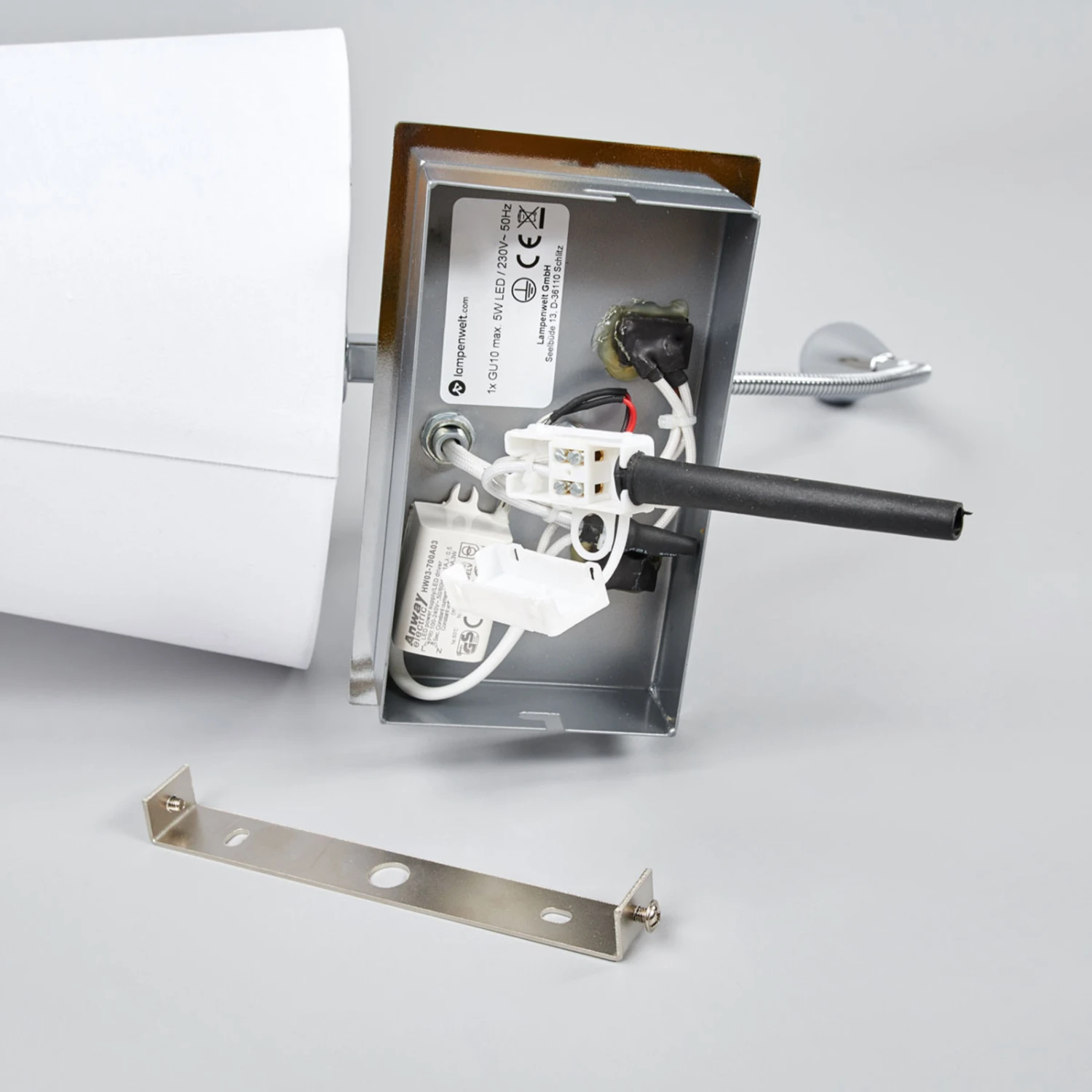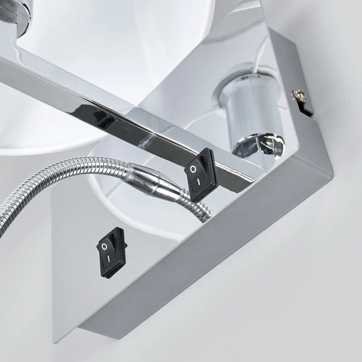Die beiden Lichtquellen lassen sich getrennt voneinander steuern, für diesen Zweck befinden sich zwei Kippschalter am verchromten Gestell der Stoffwandlampe.