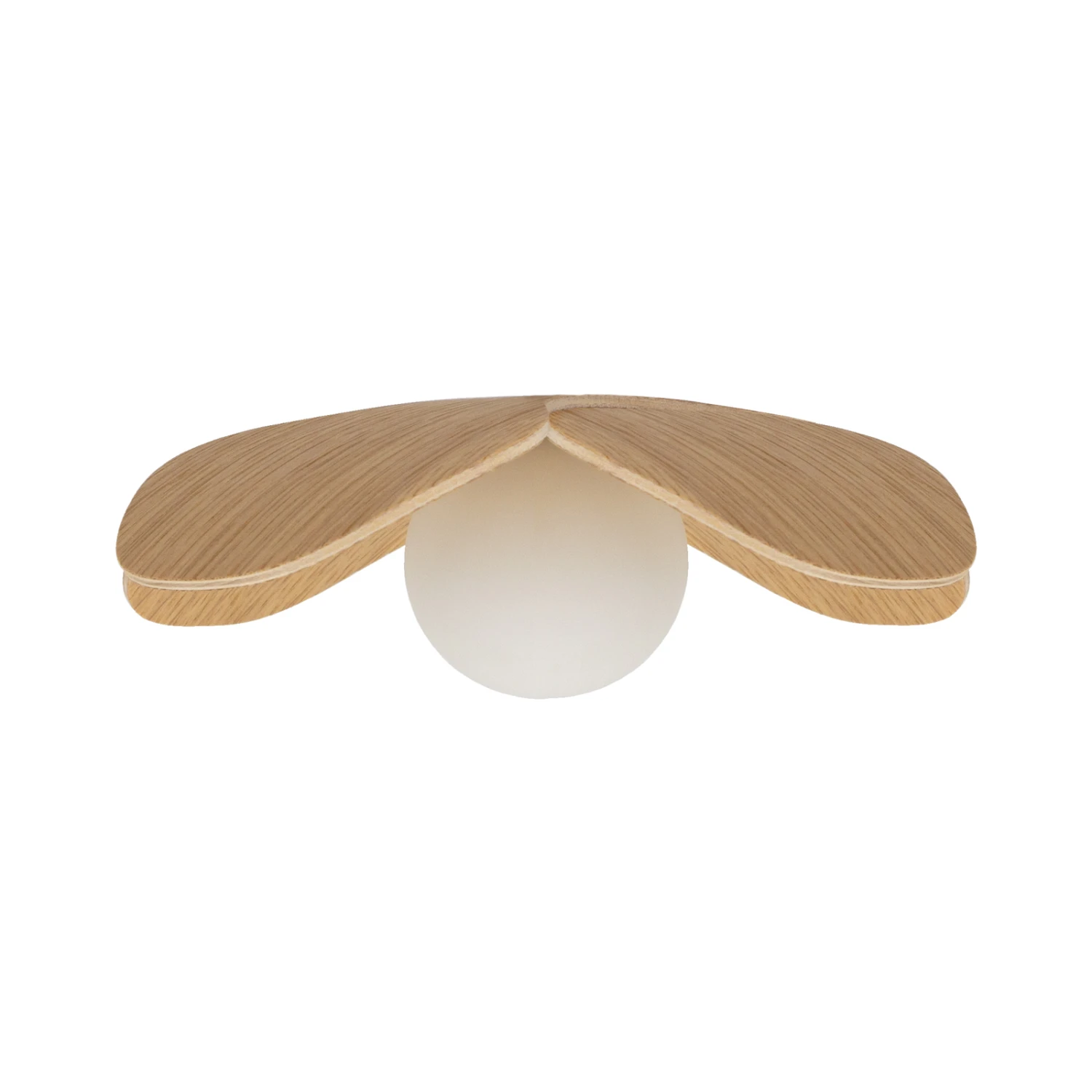Der Schirm der Leuchte besteht aus Eichenholzfurnier. Dieses bildet die Blütenblätter des Vergissmeinnichts. In der Mitte der „Blüte“ befindet sich ein kugelrunder Diffusor aus Kunststoff, der das Licht blendfrei im Raum verteilt. Die Pendelleuchte kann einzeln oder auch zu mehreren nebeneinander aufgehängt werden, so dass z. B. ein großer Esszimmertisch oder eine Theke ausgeleuchtet werden können.
