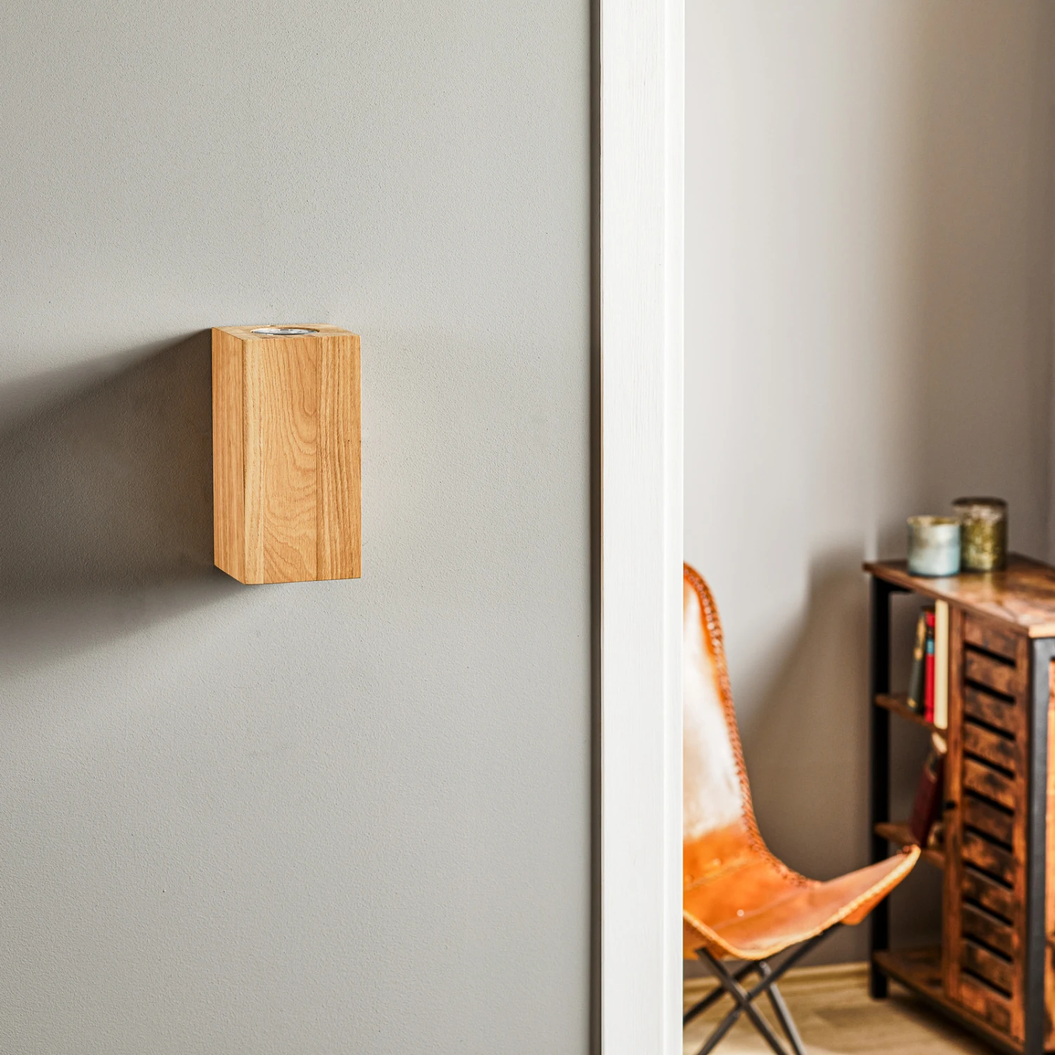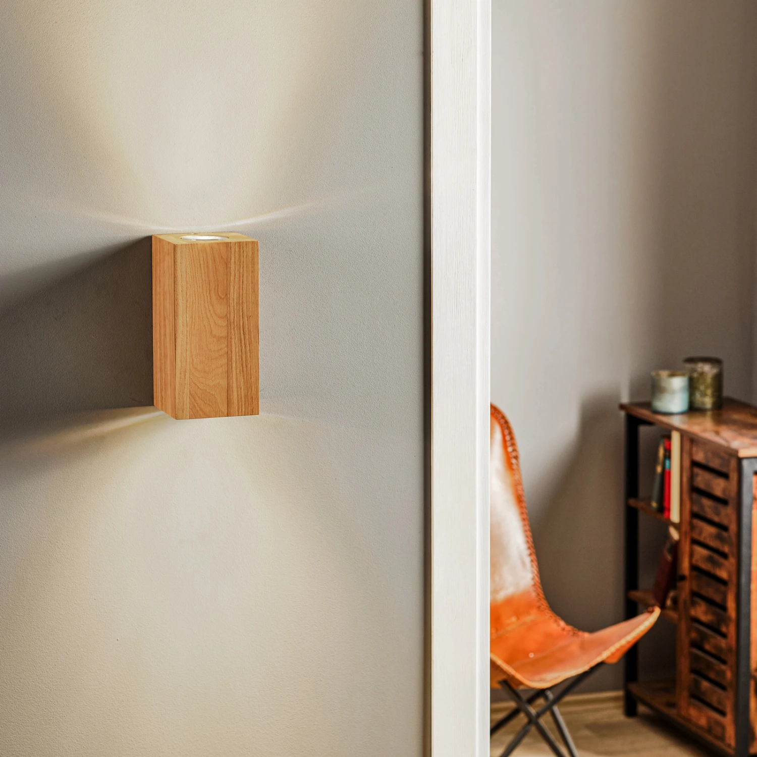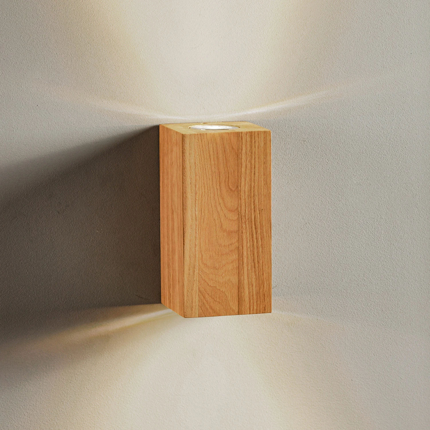 Der schlicht quaderförmig gestaltete Schirm der Wandleuchte Wooddream ist aus geöltem Eichenholz gearbeitet. Mit diesem Look passt die zweiflammige Wandleuchte zu modernen Einrichtungsstilen, besonders gut jedoch zum skandinavischen Stil oder zum modernen Landhausdesign. Es sind zwei GU10-Fassungen integriert, in die energieeffiziente LED-Lampen eingesetzt werden können. Diese fluten die Wand ober- und unterhalb mit behaglichem Licht.