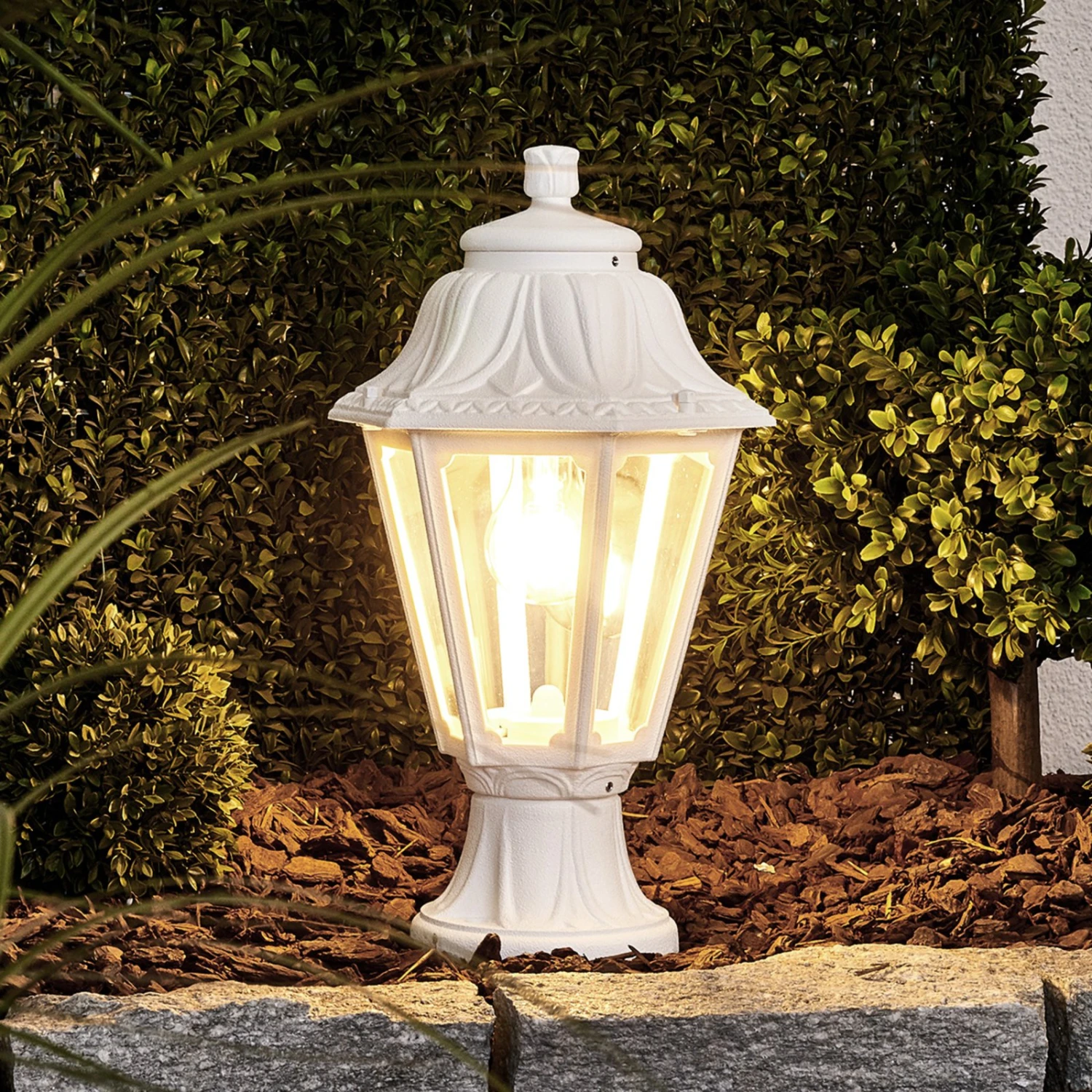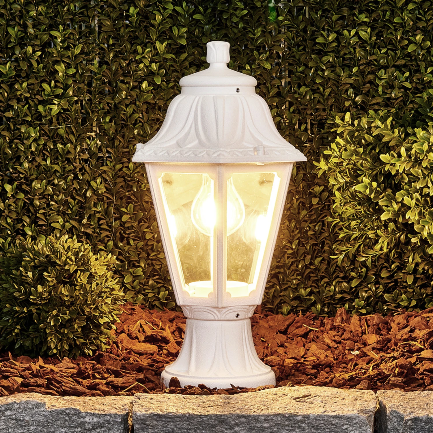 Sie verleiht einem Außengelände im klassischen Stil den letzten Schliff. Die weiße Sockelleuchte Mikrolot Anna in Laternenform setzt als Begrenzungsleuchte Maßstäbe. Ob als leuchtende Eckpfeiler auf der Grundstücksmauer oder als Beetbegrenzung auf dem Gartenweg: Mikrolot Anna schafft in jeder Umgebung mit stimmungsvollem, warmweißem LED-Licht ein behagliches Ambiente. Sie glänzt zudem mit seewasserfester Verarbeitung: Laterne und Fuß bestehen aus stoßfestem, rost- und korrosionsbeständigem Resin. Der Schirm aus PMMA ist klar gehalten, so dass man das Leuchtmittel im Inneren sehen kann. Es handelt sich um ein LED-Filament-Leuchtmittel mit E27-Fassung, das das Aussehen einer herkömmlichen Glühlampe mit innovativer LED-Technik kombiniert. Das Leuchtmittel ist inbegriffen.