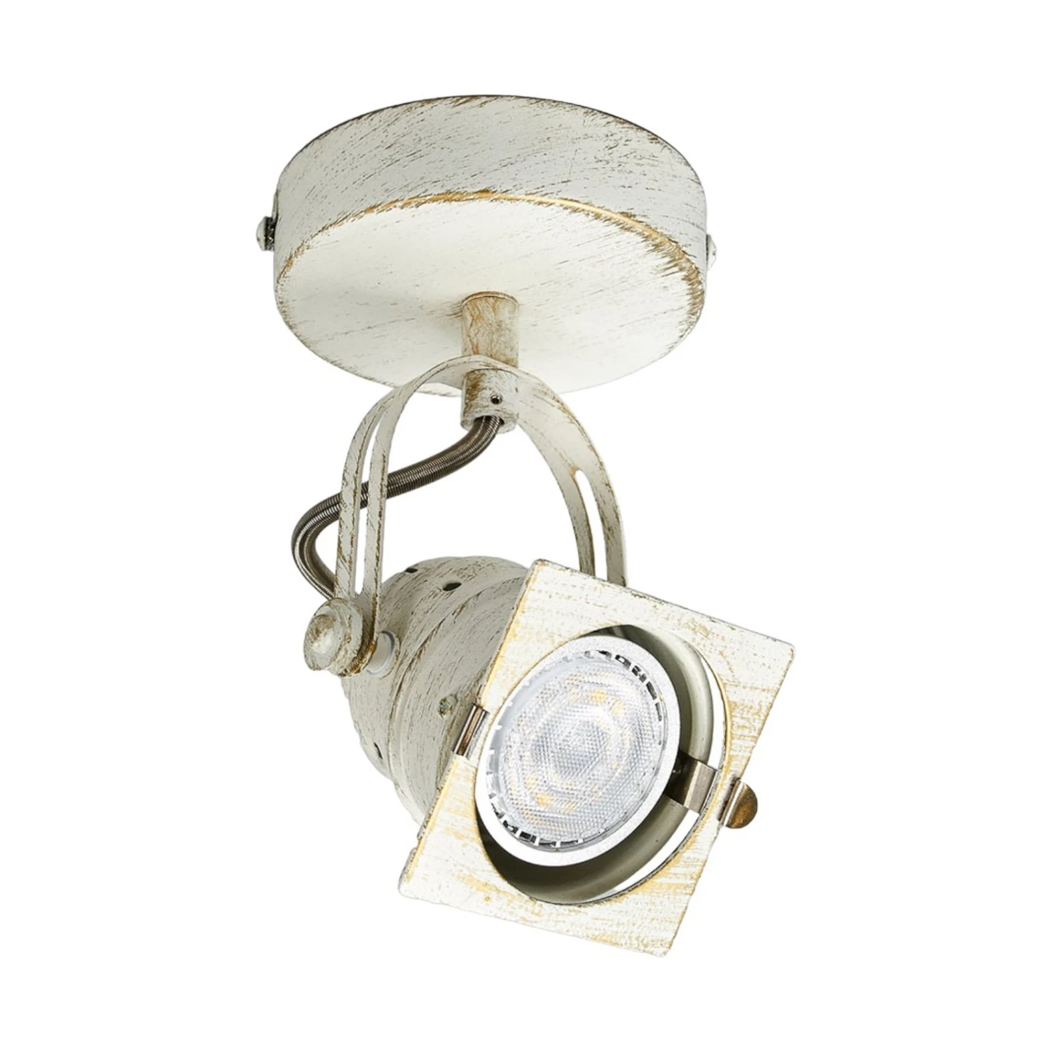 Janek, ein Spot, der sowohl an der Wand als auch an der Decke montiert werden kann, verfügt über ein Gelenk, so dass die Richtung des Lichts beliebig bestimmt werden kann. Die Oberfläche des Metalls ist in einem antik wirkenden Weiß gehalten, so dass man den Spot insgesamt sehr gut in Stile integrieren kann, die nostalgisch anmuten oder vielleicht auch industriell wirken.